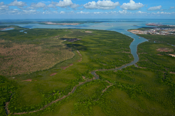 Wishart Business Precinct future peninsula stages fronting Hudson Creek. INPEX in distance at left